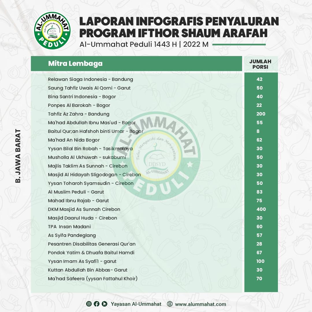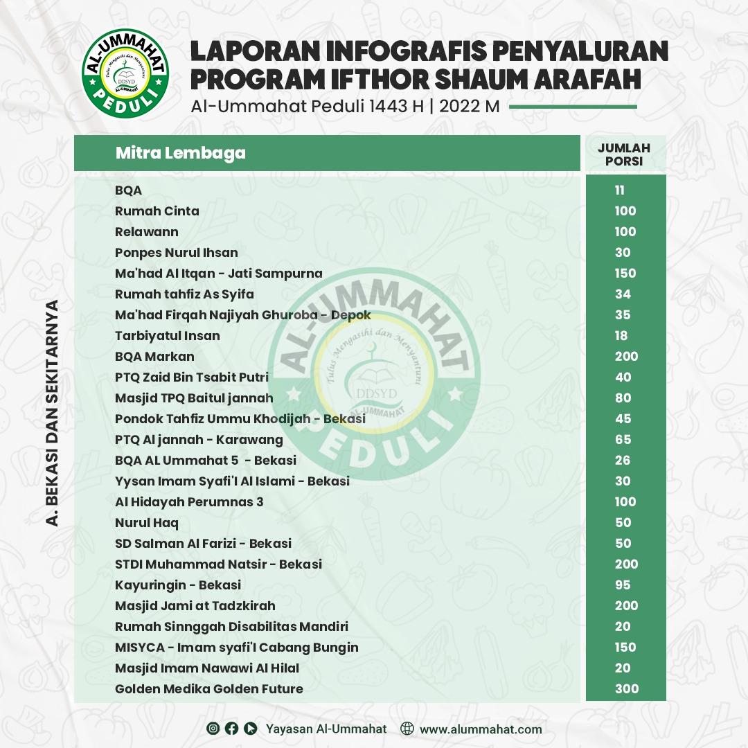 Bismilah, berikut ini Laporan Infografis Penyaluran Program Ifthor Shaum Arafah 1443 H Yayasan Al-Ummahat Bekasi, Info lebih lanjut silahkan hubungi kami, Klik Disini