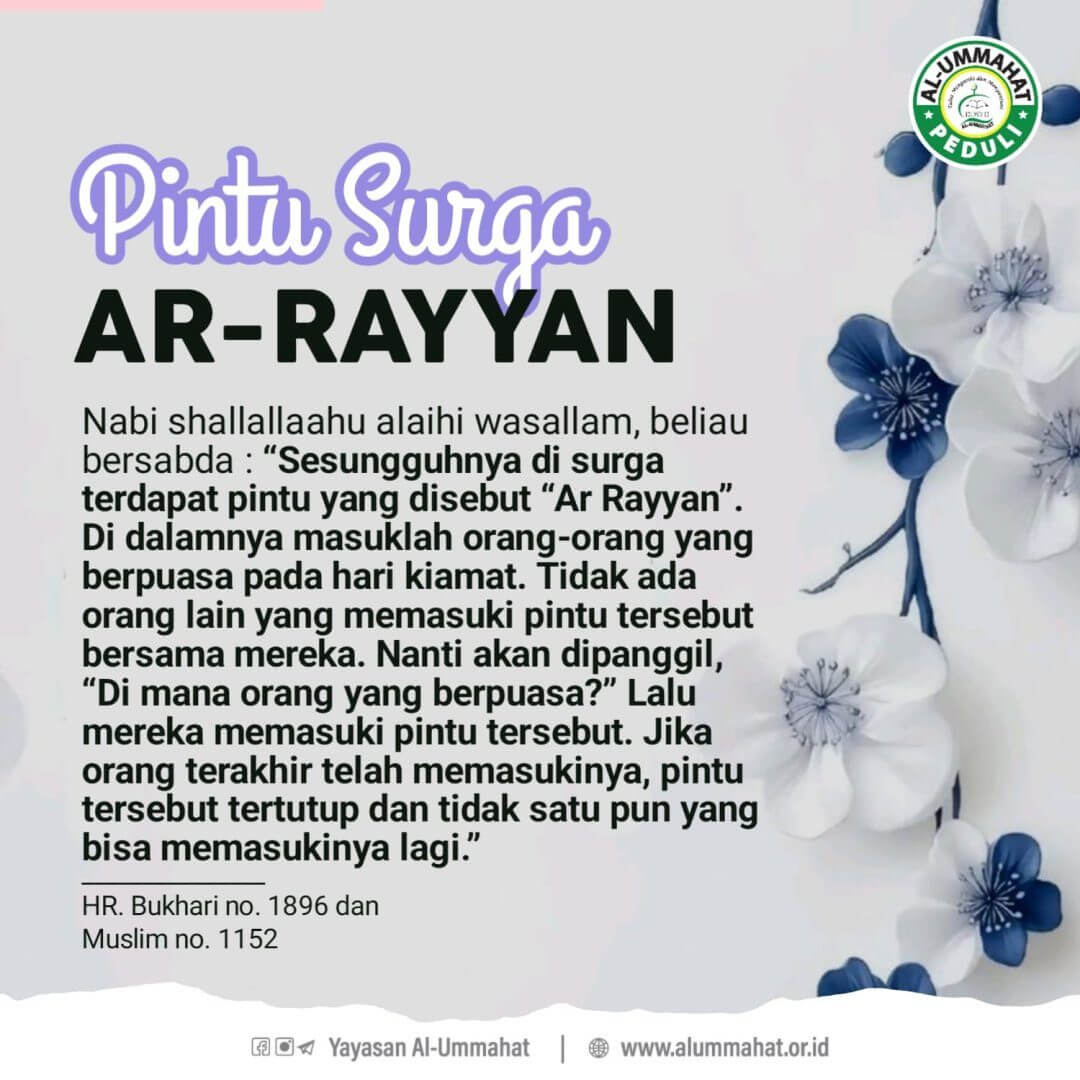 “Sesungguhnya di surga terdapat pintu yang disebut “Ar Rayyan”. Di dalamnya masuklah orang-orang yang berpuasa pada hari kiamat. Tidak ada orang lain yang memasuki pintu tersebut bersama mereka. Nanti akan dipanggil, “Di mana orang yang berpuasa?” Lalu mereka memasuki pintu tersebut. Jika orang terakhir telah memasukinya, pintu tersebut tertutup dan tidak satu pun yang bisa memasukinya lagi.”